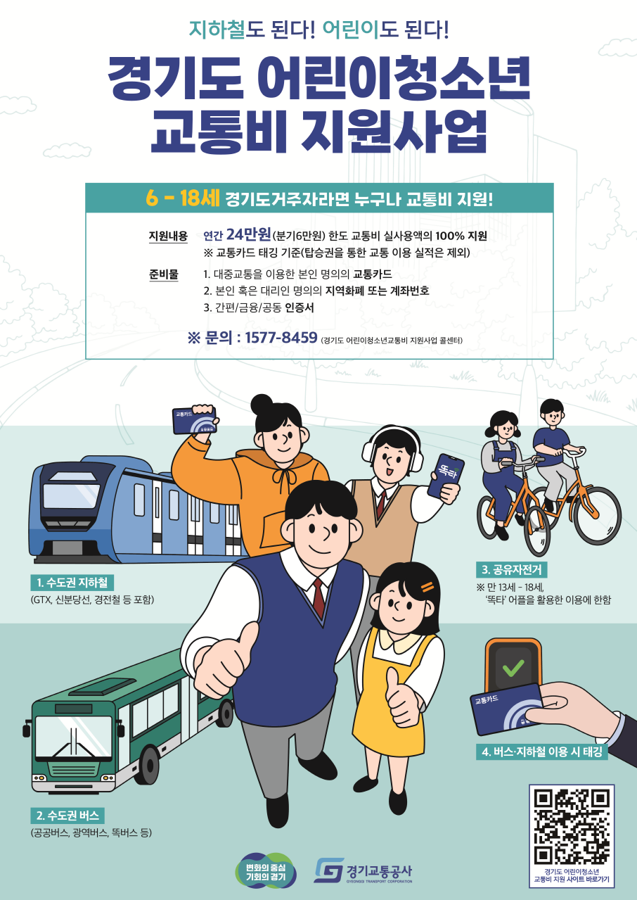 자세한 사항은 경기도 어린이청소년 교통비 지원 포털 누리집과 경기교통공사 콜센터(1577-8459)에서 확인할 수 있습니다.