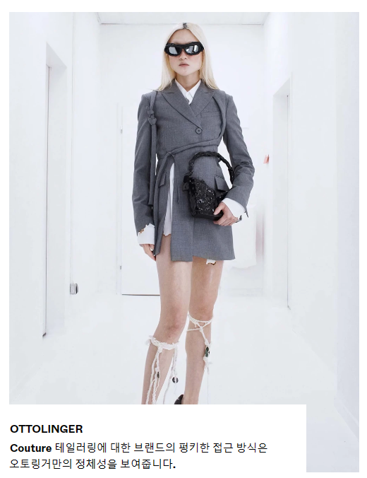 정통 쿠튀르 테일러링에 반문화적으로 접근하며 새롭고 신선한 시각에서 섹시한 디자인을 선보입니다. 오토링거의 특징적인 추상과 해체적 요소, 비대칭 실루엣, 펑키한 디테일과 패턴은 패션계에 큰 반향을 일으키며, 두터운 팬층을 형성하고 있습니다.