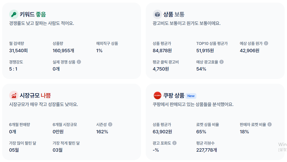 키워드의 경쟁률은 너무 좋으나 시장 규모가 너무 적으므로 네이버에서 판매할 상품으로 소싱하기에는 적합하지 않은 것 같다. 쿠팡에서 판매할 용도로는 괜찮은 듯.