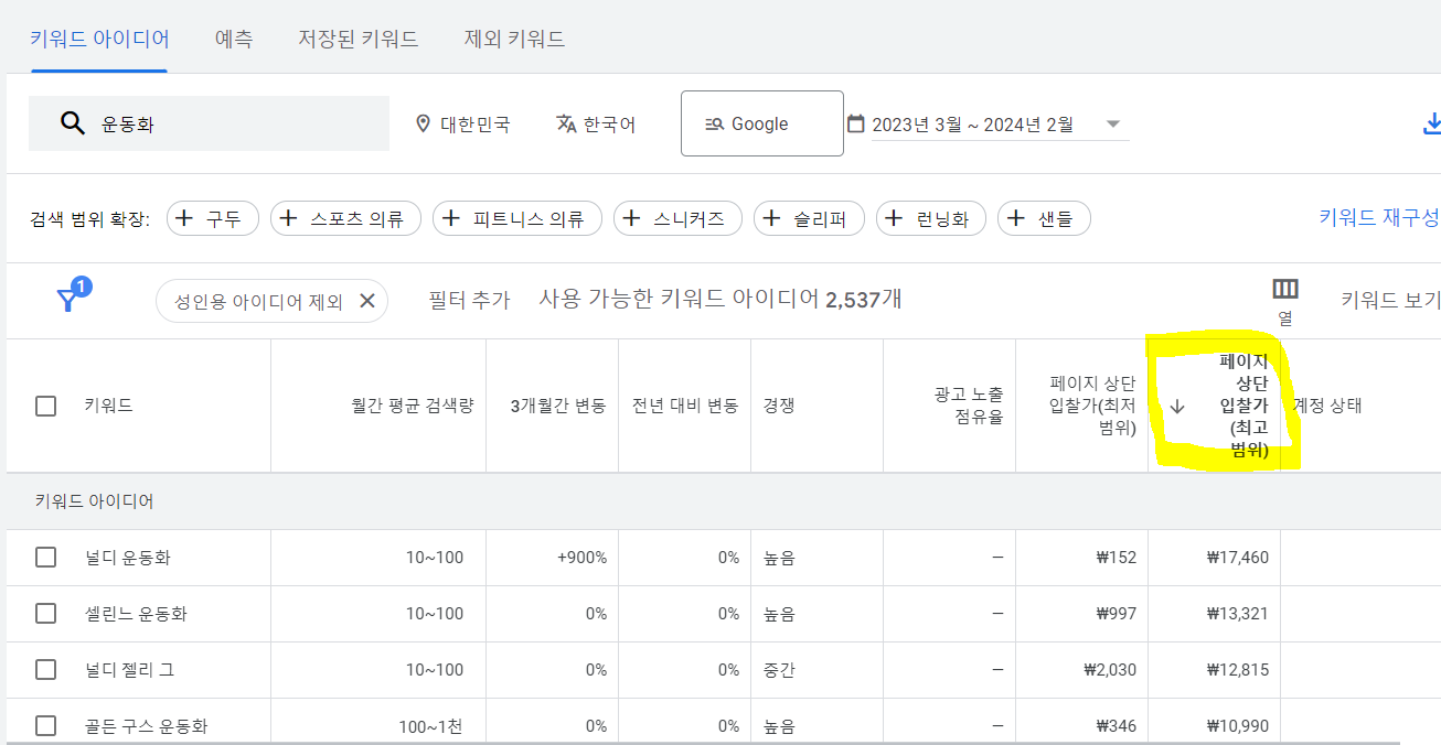 키워드 플래너를 보실 때 페이지 상단 입찰가의 최저범위와 최고 범위에 필터를 걸어서 상위 금액 순으로 보시면 어떤 키워드가 높은 광고 단가를 얻을 수 있는 키워드인지 쉽게 확인이 가능합니다.